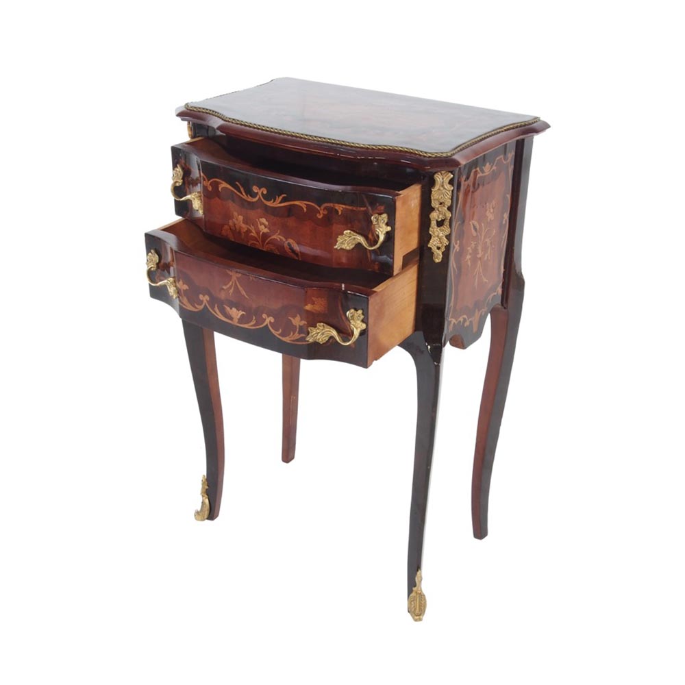路易十六仿古风格床头柜复制品,镶嵌 2 个黄色抽屉。 绝对美丽💯采用实木手工制作,黄铜饰品,闪亮抛光,并带有卷曲腿。 这把椅子有几种不同的木材; 表面采用阿拉斯加香桃木木单板,琴身采用麝香木或山毛榉木。每件作品都是独一无二的。 它非常适合卧室、书房或商务场合。