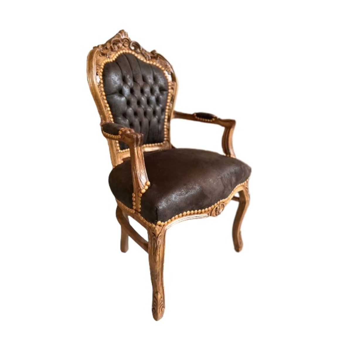 经典法式巴洛克风格扶手椅,始终是我们最畅销的产品之一! 它会照亮客厅或书房。椅子由实心山毛榉木制成,并配有巧克力色人造皮革和坚固的钉子,具有复古外观。每把椅子都是独一无二的; 舒适稳定。 我们手工制作的巴洛克风格椅子提供舒适的坐感。